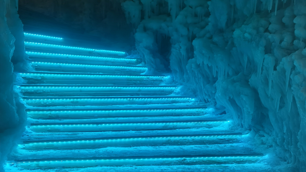 In the Ice and Snow World project, IP68 integrated waterproof RGBW soft light strips controlled by DMX512 are installed in the tunnel ice sculptures, and the lights are directly frozen inside; ultra-thin IP68 integrated waterproof colorful soft light strips are installed on the steps
