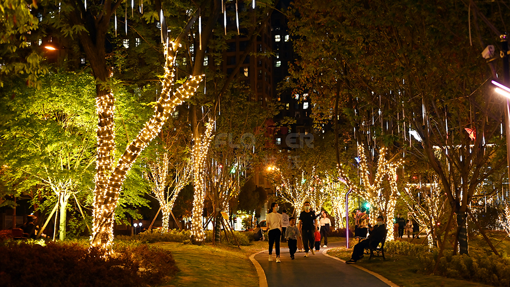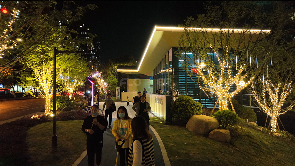 The project uses IP68 integrated waterproof soft light strips for buildings and overpasses. LED starry sky light strings and simulated modeling lights are used on both sides of the greenway to create a warm and comfortable atmosphere. The low-voltage power supply mode of all products meets the safety and stability of long-term outdoor use. While developing a low-carbon night view mode, it can also meet the night entertainment needs of amusement, which not only improves the night view atmosphere of the future community, but also enhances the livable experience of residents.