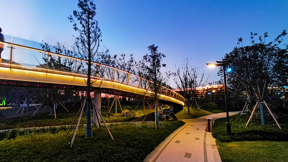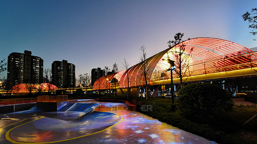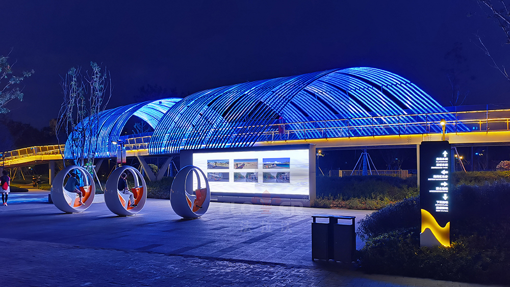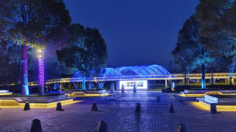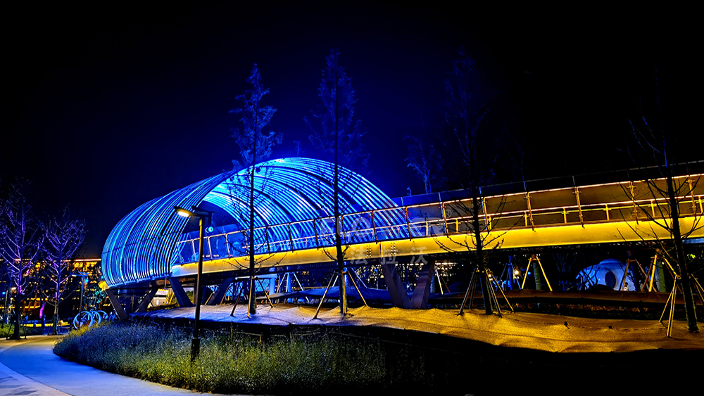 Located in front of the Nanhu District Government, in the center of Jiaxing City, it is the core functional area of ​​Nanhu District and a modern city image display area. The artistic steel pipes of the pedestrian overpass use IP68 colorful soft lights. Through the change of patterns and the combination of fog and forest, the experience and participation of the people in the square activities are increased.